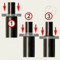 Первый способ. Кольцо начинаем монтировать с узкой стороны плунжера (Рис.2). Кольцо выполнено из материала очень похожего на какой-то аналог капролона и со схожими физическими свойствами. Он имеет некоторую эластичность. Со стороны, откуда мы собирается надевать кольцо, на плунжере имеется коническая проточка. Она нам поможет легкими ударами натянуть кольцо (Рис.3) Внутренняя часть кольца будет слегка сминаться, принимая форму плунжера (Рис.3_2и3). Это обеспечит плотную посадку для обеспечения герметичного соединения. Так же поступаем и со вторым кольцом. По этой посадке и будет скользить плунжер в качестве насосного элемента. Оратите внимание на то, какой стороной должно быть установлено кольцо. У кольца с одной стороны имеется маленький конический выступю Он должен быть направлен в сторону цилиндра, т.е. если по Рис.2, то выступ должен быть сверху.
