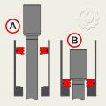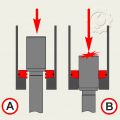 Во втором способе вставляем вначале кольцо конусным выступом вниз (Рис.5_А). Следом вставляем плунжер и поталкиваем всю эту сборку до упора в цилиндре (Рис.5_В). Затем маленьким молоточком аккуратно осаживаем плунжер (Рис.6_А). Наша задача добиться прохождения плунжера через кольцо (Рис.6_В).